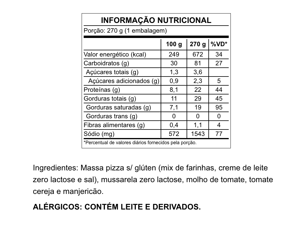 Ingredientes: Massa pizza s/ glúten (mix de farinhas, creme de leite zero lactose e sal), mussarela zero lactose, molho de tomate, tomate cereja e manjericão.