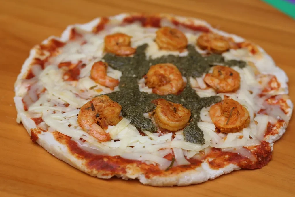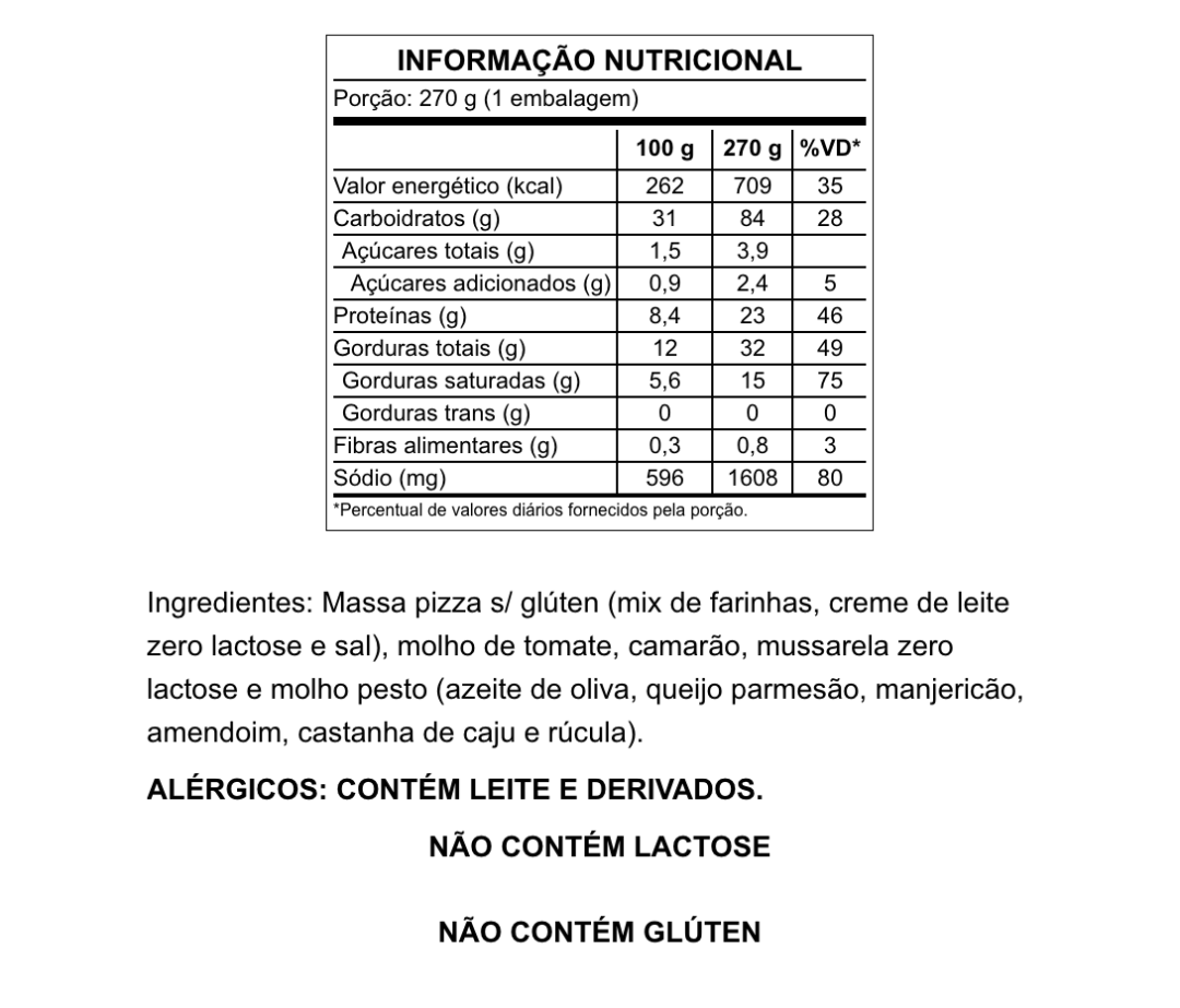 Ingredientes: Massa pizza s/ glúten (mix de farinhas, creme de leite zero lactose e sal), molho de tomate, camarão, mussarela zero lactose e molho pesto (azeite de oliva, queijo parmesão, manjericão, amendoim, castanha de caju e rúcula).