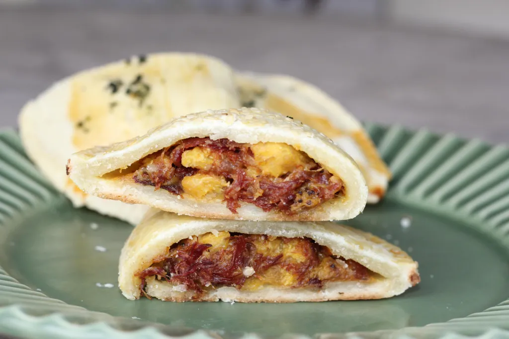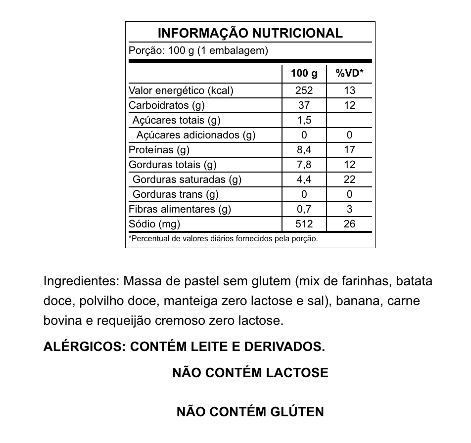 Ingredientes: Massa de pastel sem glúten (mix de farinhas, batata doce, polvilho doce, manteiga zero lactose e sal), banana, carne bovina e requeijão cremoso zero lactose.