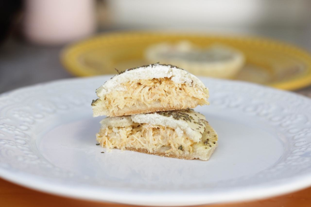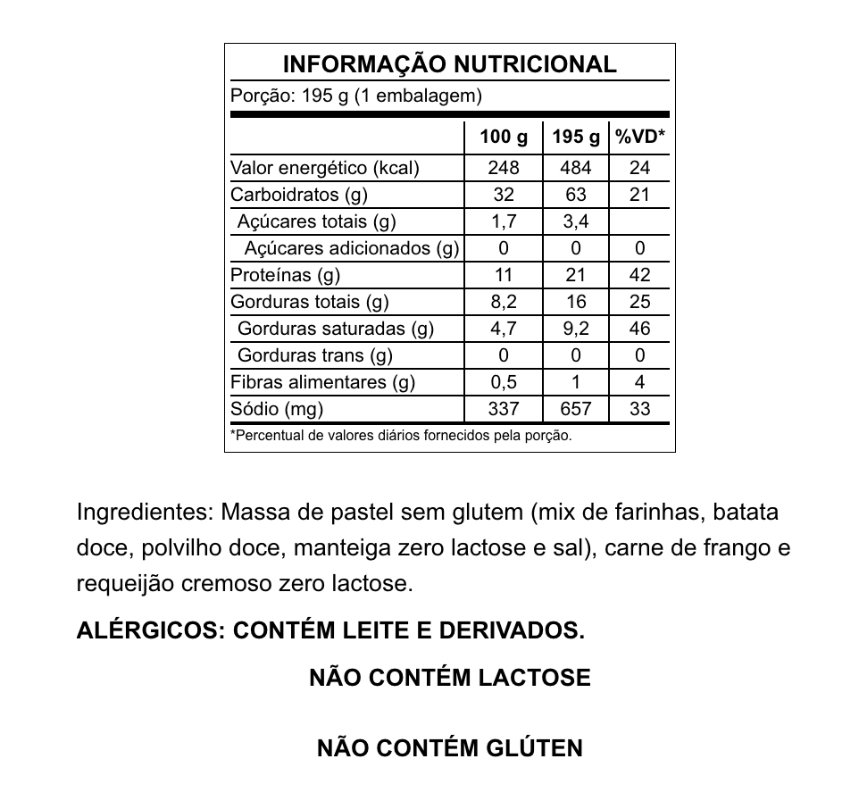 Ingredientes: Massa de pastel sem glutem (mix de farinhas, batata doce, polvilho doce, manteiga zero lactose e sal), carne de frango e requeijão cremoso zero lactose.