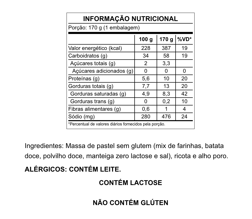 Ingredientes: Massa de pastel sem glúten (mix de farinhas, batata doce, polvilho doce, manteiga zero lactose e sal), ricota e alho poró.