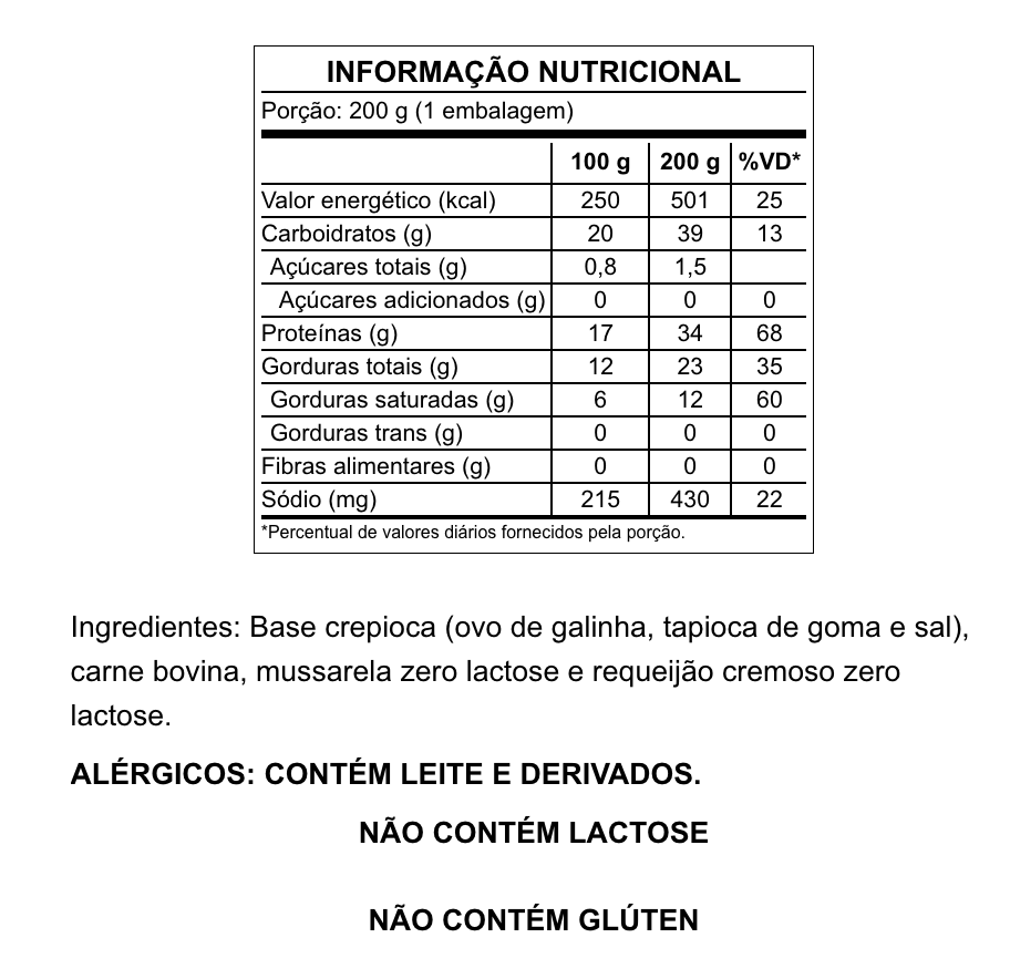 Ingredientes: Tapioca, ovo, queijo mussarela zero lactose, requeijão cremoso zero lactose. 190g