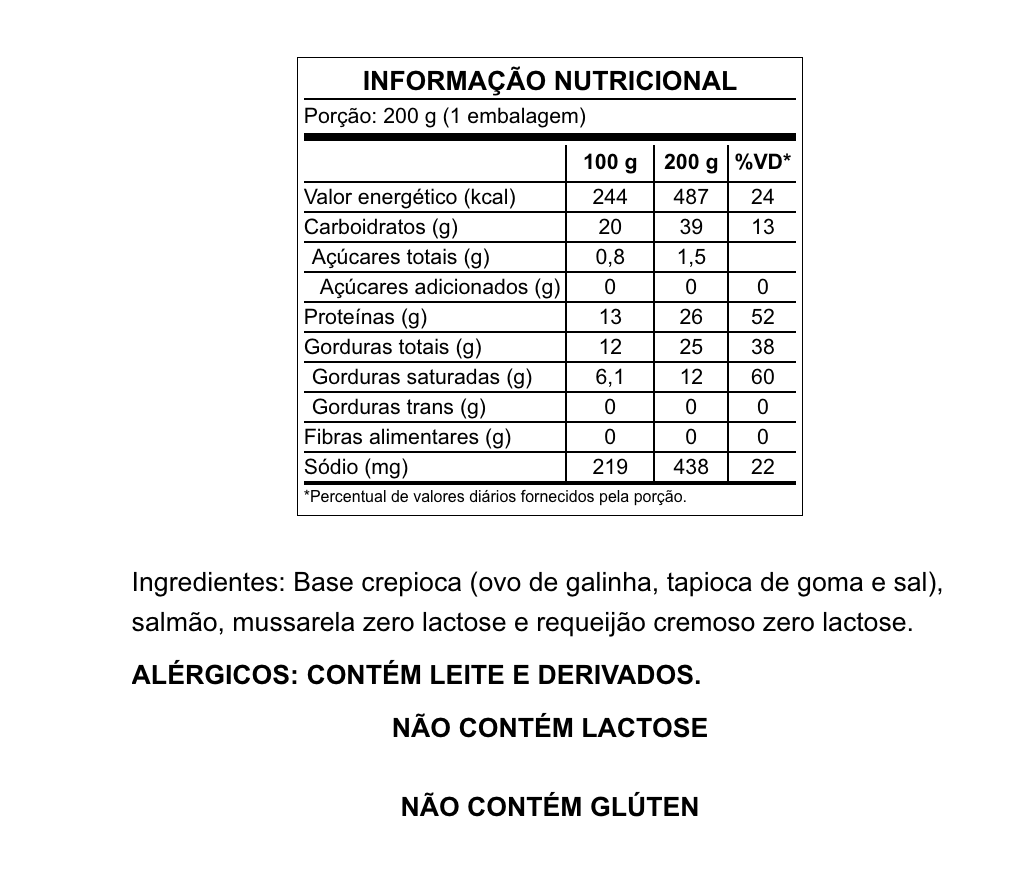 Ovo de galinha, salmão, tapioca de goma, queijo parmesão e requeijão cremoso zero lactose. 190g